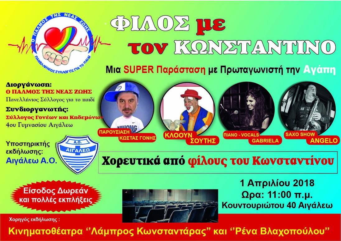 Πλήθος κόσμου προσήλθε στα κινηματοθέατρα Αιγάλεω - Κωσταντάρας – Βλαχοπούλου για την (συμ)παράσταση αγάπης «φίλος με τον Κωνσταντίνο» την Κυριακή 1 Απριλίου 2018 στις 11:30π.μ.